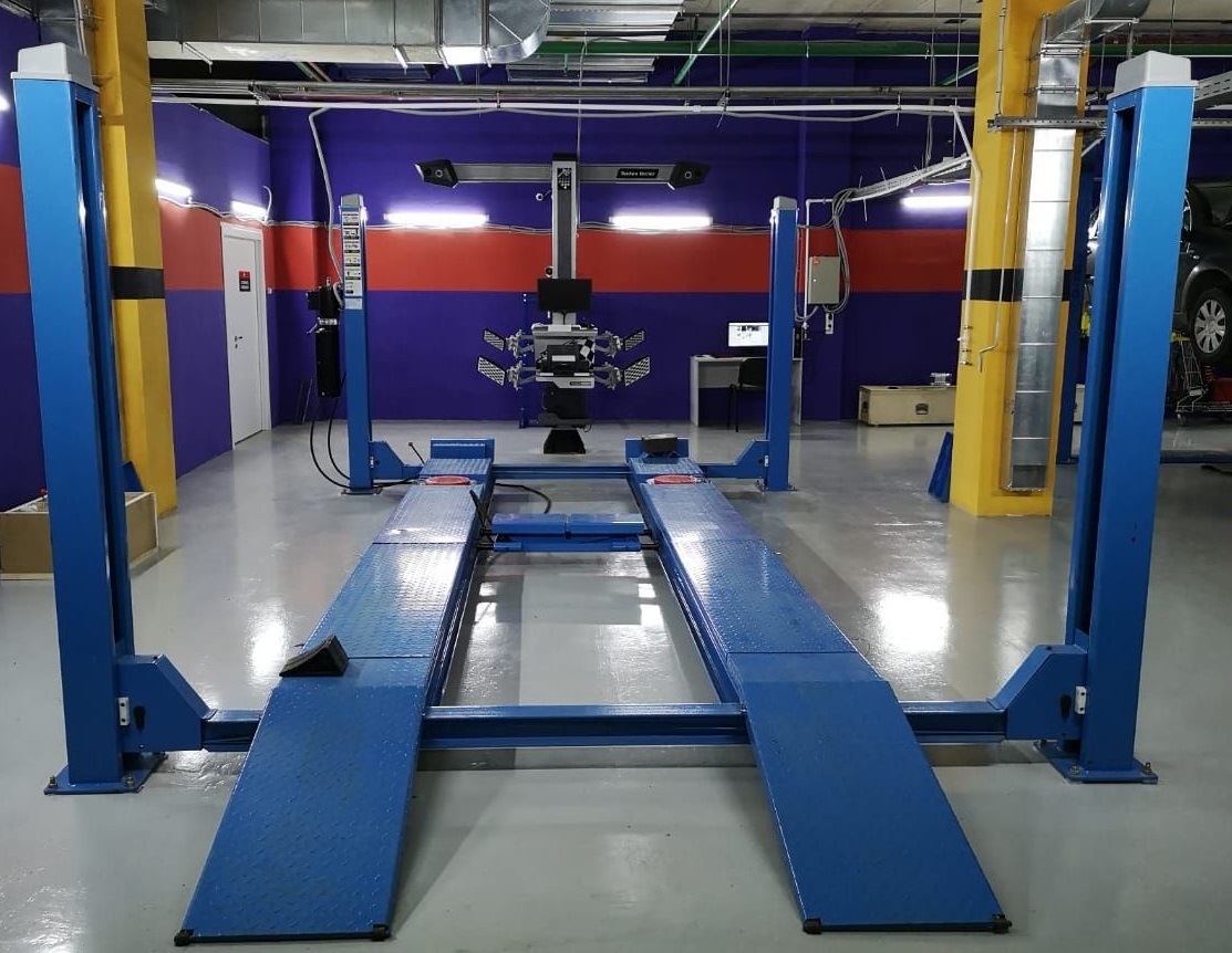 Подъемник электрогидравлический четырехстоечный F4D-4 грузоподъемностью 4 тонны, предназначен для системы сход-развала схождения колес, оснащен местами для поворотных кругов и задними сдвижными платформами, оборудован гидравлической двухточечной траверсой грузоподъемностью 2 тонны.